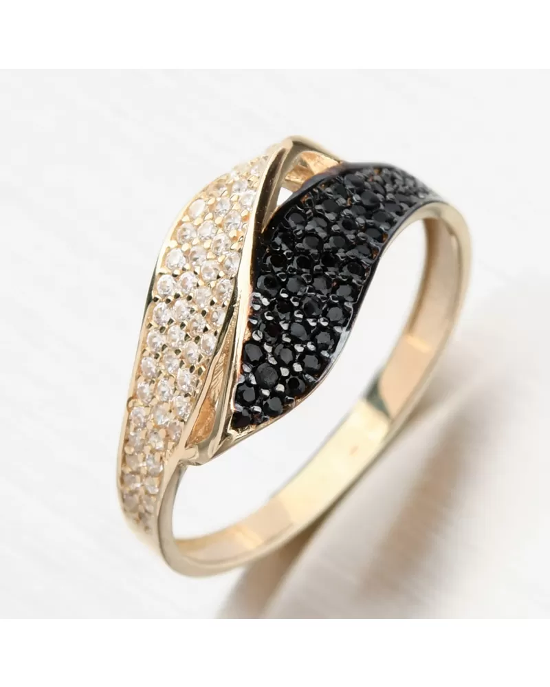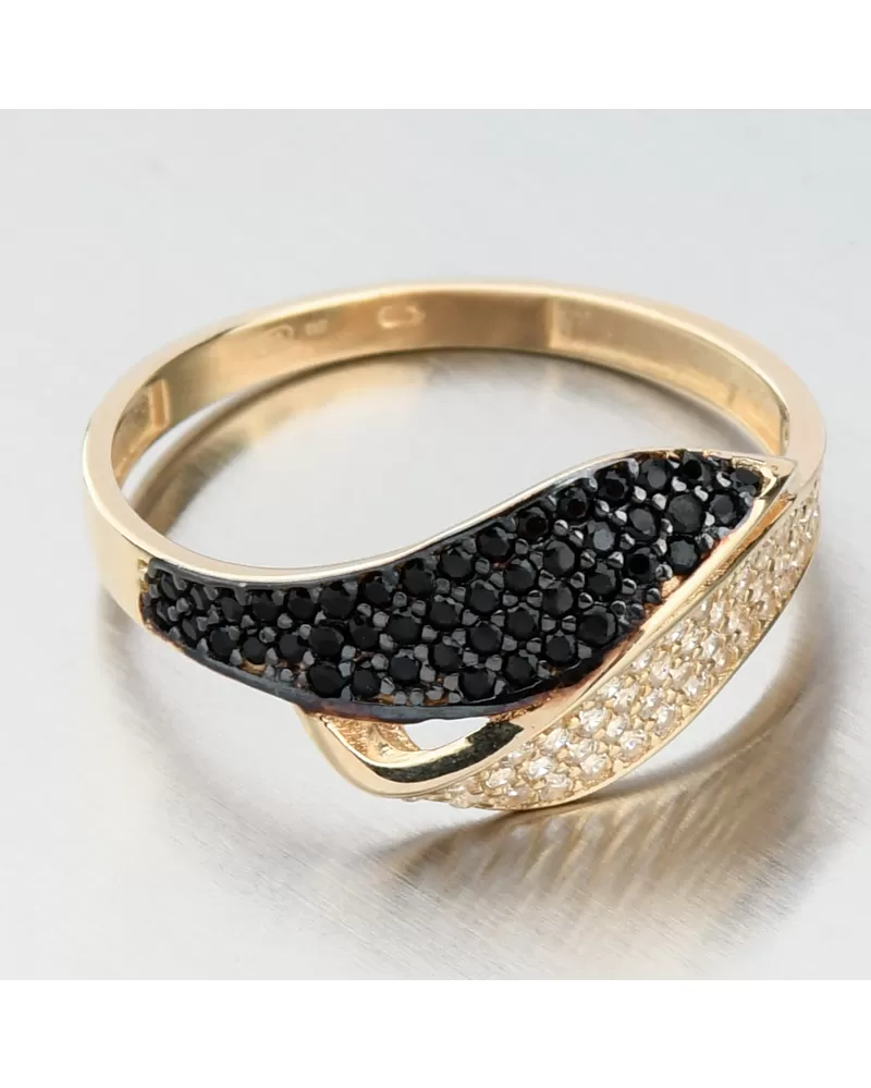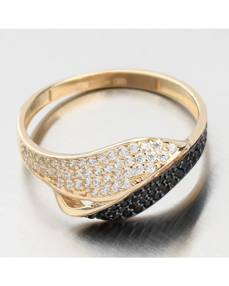 Tento elegantní zlatý prsten zaujme svým originálním designem, který spojuje kontrast černých a bílých kamínků v harmonickém vlnitém vzoru. Zirkony jsou briliantového brusu, který zajišťuje maximální brilanci vybroušených facet, dokonale odráží světlo a neuvěřitelně září z každého úhlu pohledu. Prsten působí luxusně a přitom nadčasově – skvělá volba pro ženy, které chtějí vyniknout jemnou elegancí.
