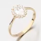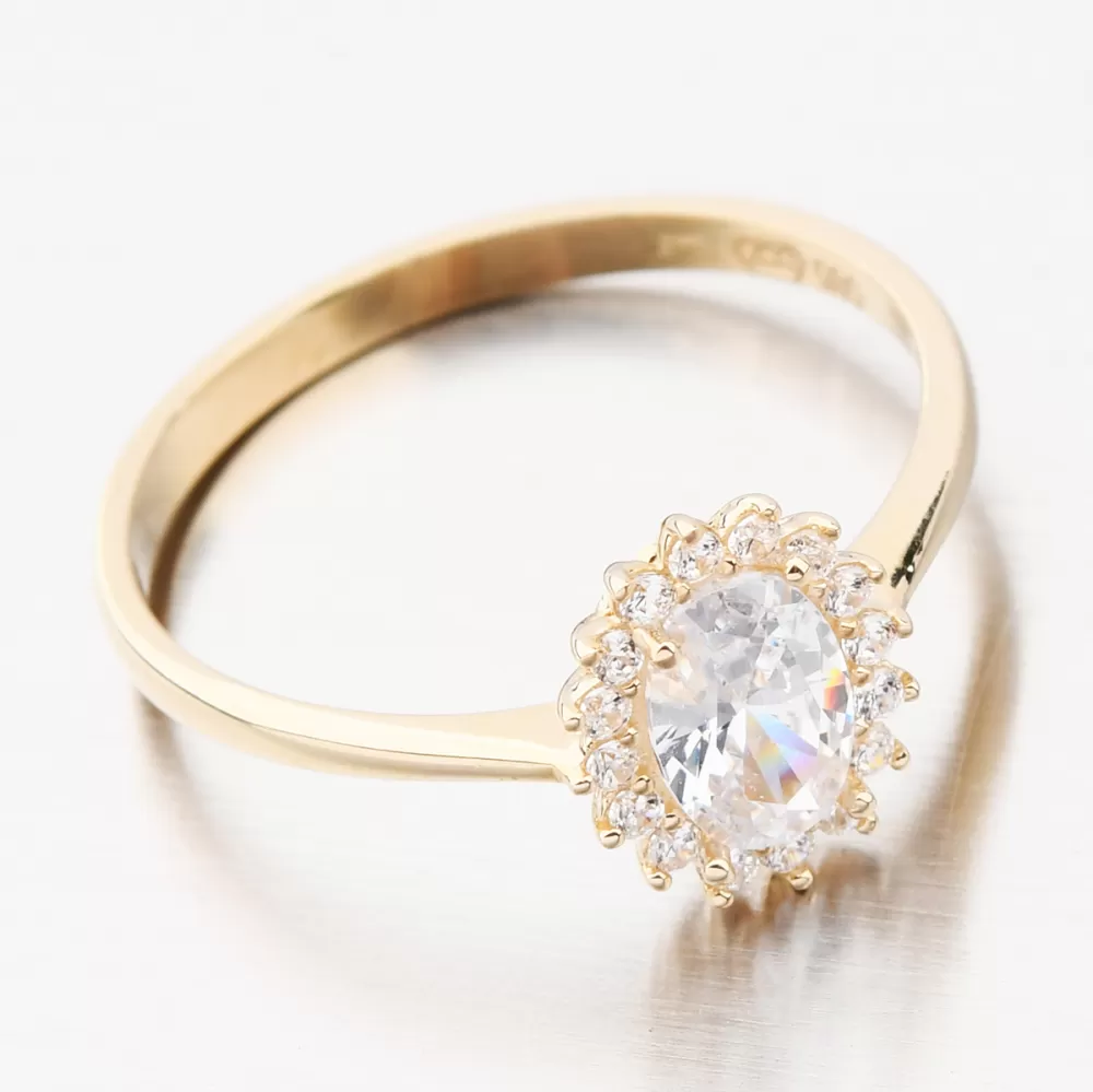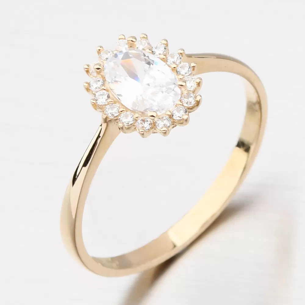 Dámský zlatý prsten Vás uchvátí svou brilancí, kterou získal díky precizně broušenému zirkonu do oválného tvaru. Kolem oválného zirkonu jsou vsazeny menší zirkony v briliantové brusu a dokonale ucelují luxusní vzhled prstenu.