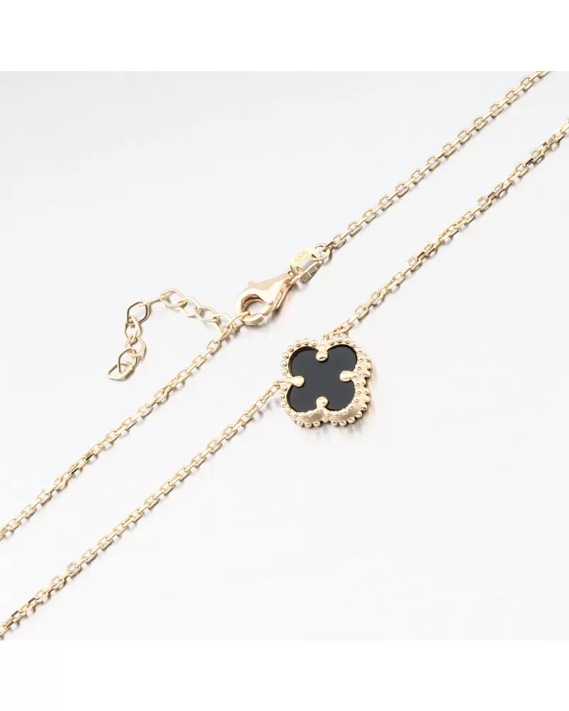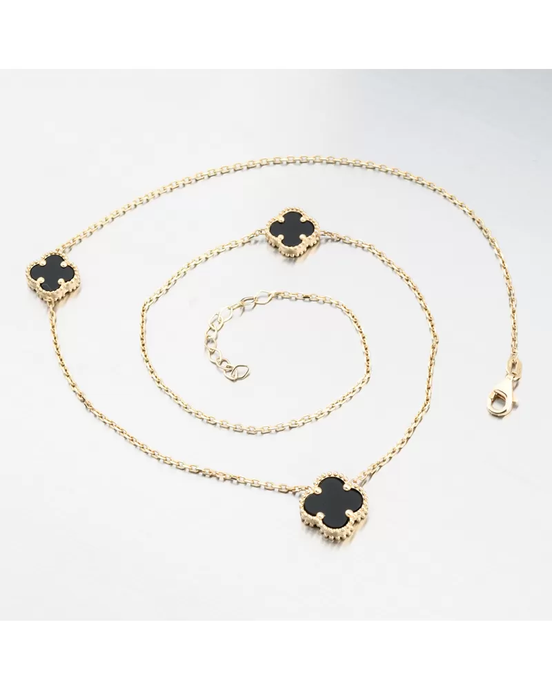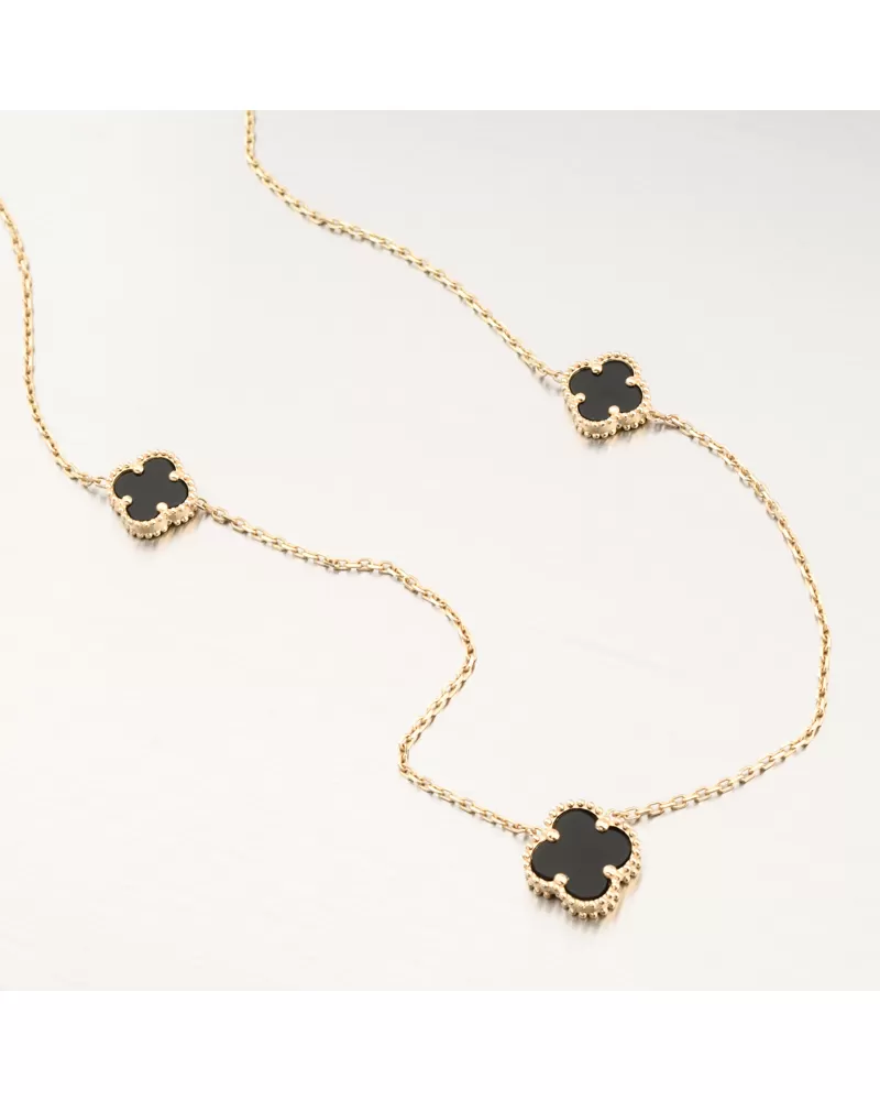 Výrazný, moderní a dokonale vyvážený design. Tento zlatý náhrdelník zdobí tři černé čtyřlístky zasazené v ozdobném zlatém rámečku. Hladký černý kámen vytváří elegantní kontrast se zlatem, díky čemuž působí šperk luxusně a nepřehlédnutelně.