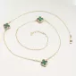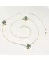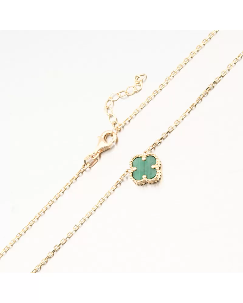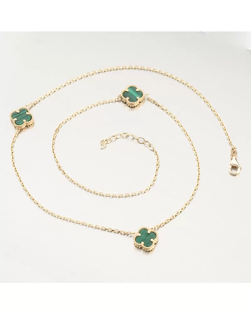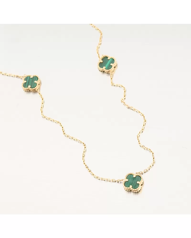Tento zlatý náhrdelník zdobí tři jemné čtyřlístky v sytém zeleném odstínu. Každý čtyřlístek je zasazen v ozdobném zlatém rámečku, který podtrhuje jeho krásu a dodává celému šperku luxusní vzhled inspirovaný světovými designy.