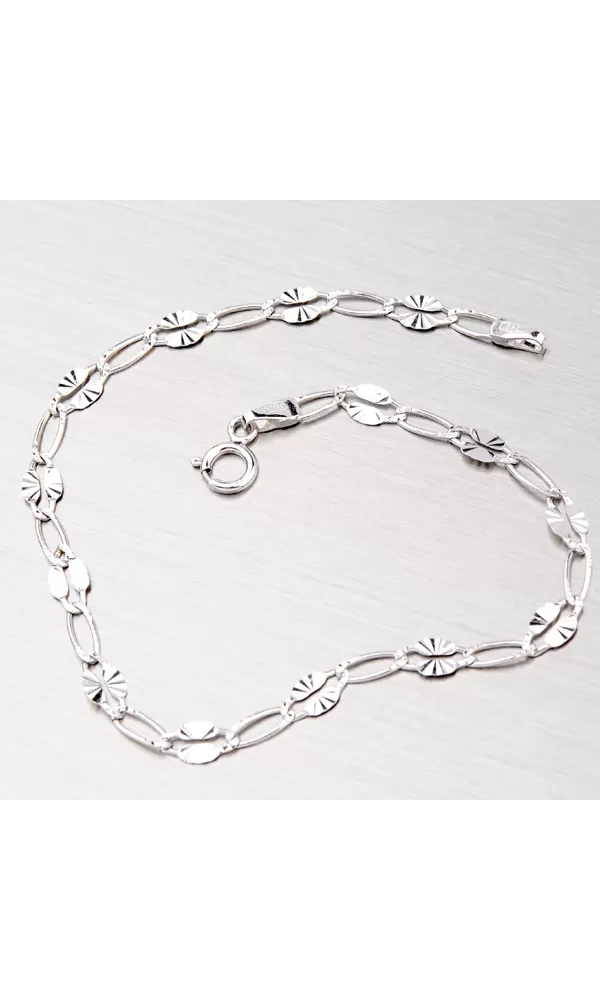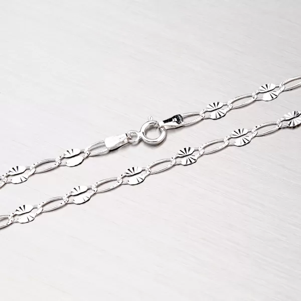 Nádherný dámský gravírovaný řetízek s většími oky je vyrobený z bílého čtrnáctikarátového zlata 585/000 v lesklé povrchové úpravě se zapínáním na pérový kroužek. Řetízek je gravírovaný za pomocí nástroje s diamantovým hrotem, který dodává šperku maximální lesk.