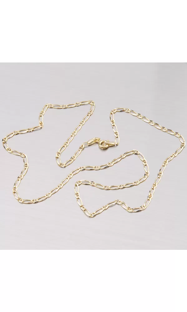 Řetízek typu Figaro 1+1 je vyroben ze žlutého čtrnáctikarátového zlata 585/1000 v lesklé povrchové úpravě. Řetízek má klasické zapínání na pérový kroužek.